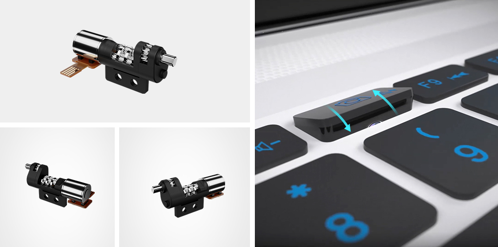 據(jù)了解,隨著筆記本逐步的輕薄化,也有廠商開(kāi)始追求極致的輕薄,追求極窄邊框,因此需要縮小屏幕周圍邊框,然而這正是大多數(shù)電腦攝像頭的安裝位置。為此,兆威別出心裁,開(kāi)發(fā)出一款帶翻轉(zhuǎn)功能的隱藏式攝像頭驅(qū)動(dòng)系統(tǒng),利用緊湊的微型驅(qū)動(dòng)結(jié)構(gòu),可以在有限的空間內(nèi),輸出較大力矩,使得攝像頭平時(shí)處于隱藏狀態(tài),當(dāng)需要時(shí)候,只需要按下鍵盤即可一鍵彈出。